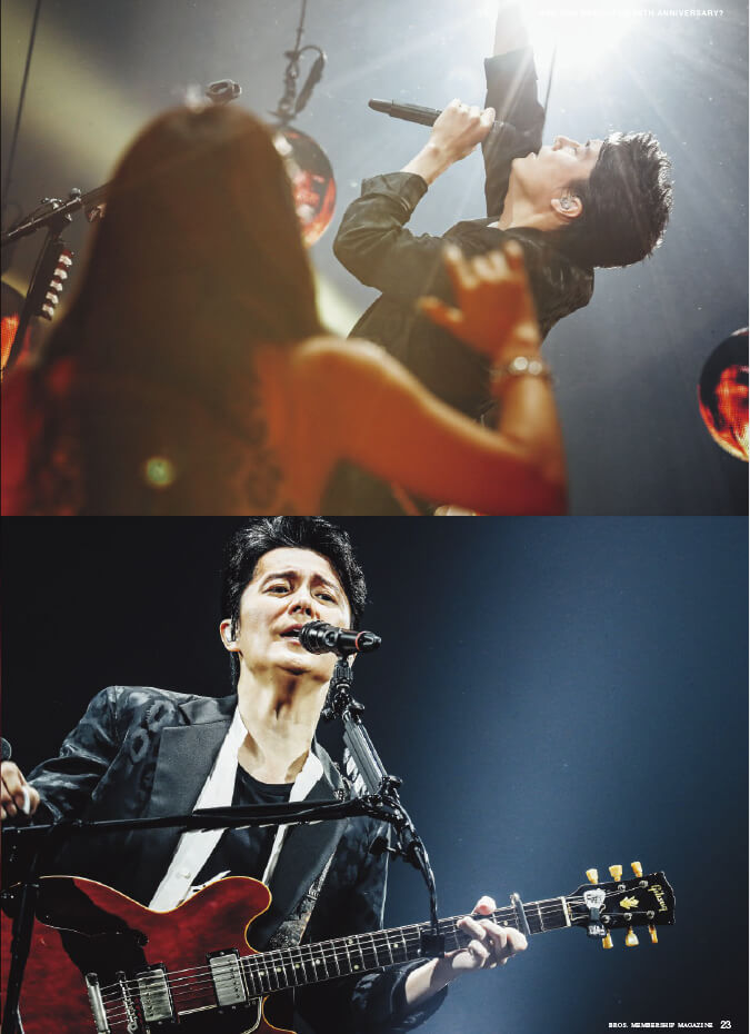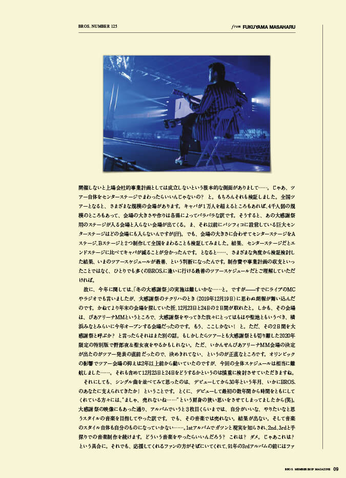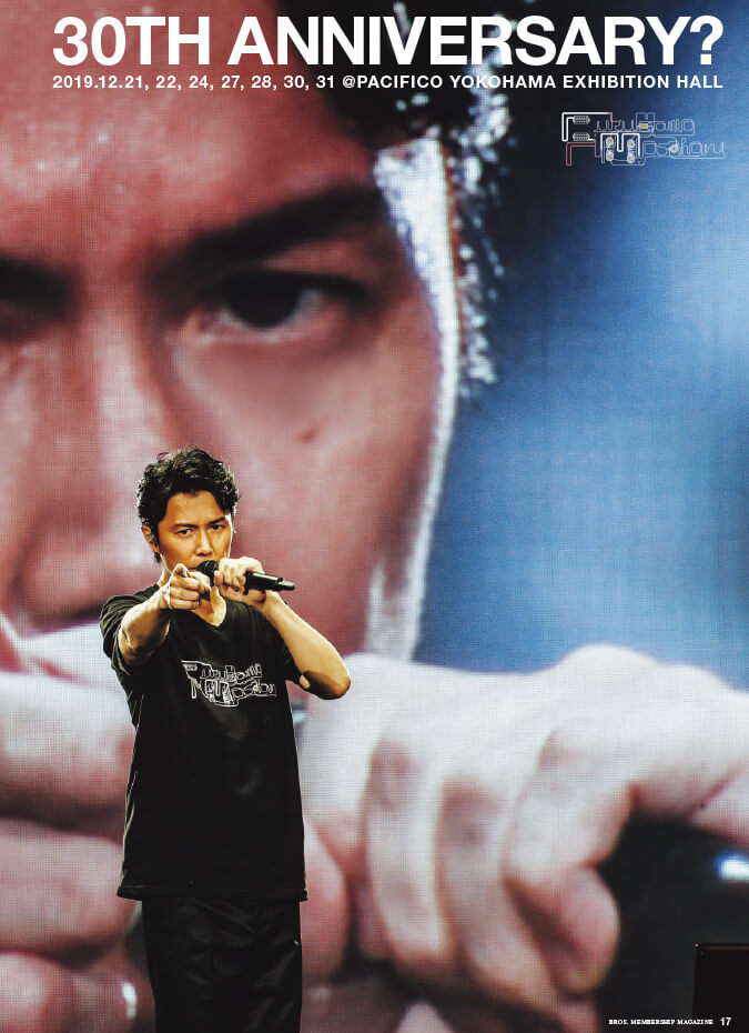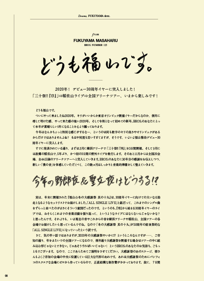 表紙をめくると、そこはもう「30周年イヤー」。3月の横浜アリーナの「序」から始まるメモリアルイヤーのスタートにあたり、福山さんの“年頭のことば”が記されています。9月の長崎・稲佐山でのライブのチケット先行案内も掲載していますので、お見逃しなく。