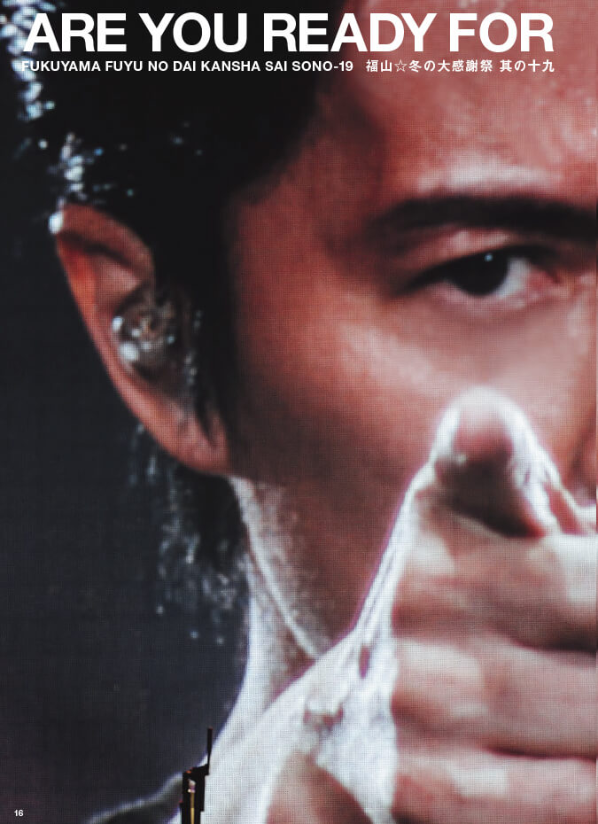 巻頭の特集は、もちろん『福山☆冬の大感謝祭 其の十九』。ライブを実際に観たあなたも、観られなかったあなたも、きっと想像力を掻き立てられる、強烈な印象を残す写真をたっぷり掲載しています。ライブレポートのほか、読み物としては、7公演の中から選りすぐったトークを集めた「MCセレクション」を掲載。そして「SCENES FROM BACKYARD」と題して、楽屋でマッサージを受ける福山さんの様子や食事メニューを紹介しています。