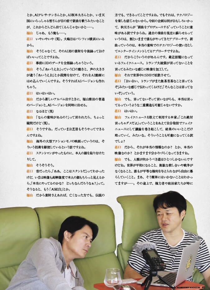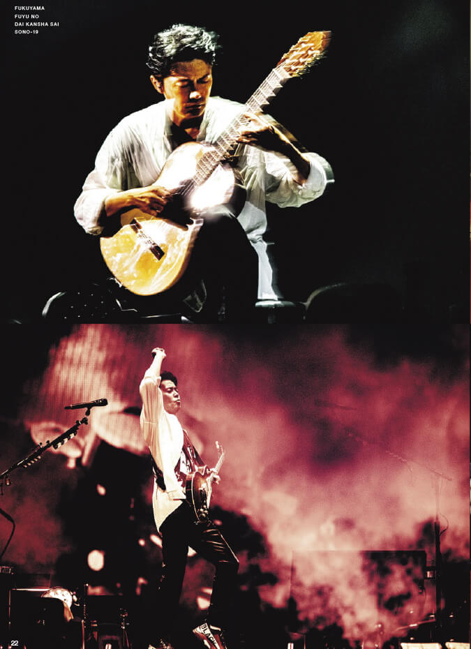 今号の表紙は、昨年末に開催された『福山☆冬の大感謝祭 其の十九』のライブショット。映画『マチネの終わりに』の中で福山さん自身が演奏したメインテーマ楽曲「幸福の硬貨」を、ステージ上で生披露した際のカット。クラシックギター1本だけで、それまでの熱狂とは対極にある、静かなる興奮の世界を作り上げた福山さん。その緊張感が伝わってくる表紙になっています。